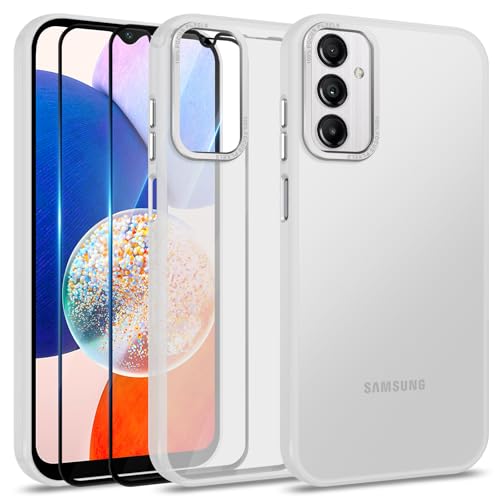 Btstring Case for Samsung Galaxy A14 4G / A14 5G and Screen Protector, Military Shockproof Protective Case with Lens Bump Alloy, Rigid Slim Phone Case, Anti-fingerprint Rugged Case Cover, White