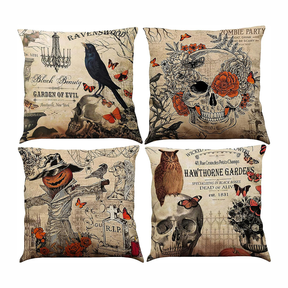 Halloween Decorative Throw Pillow Covers, Square Cushion Covers for Outdoor Sofa Couch, Scarecrow Skull Pumpkin Design, Polyester And Linen, 4PCS, Eas