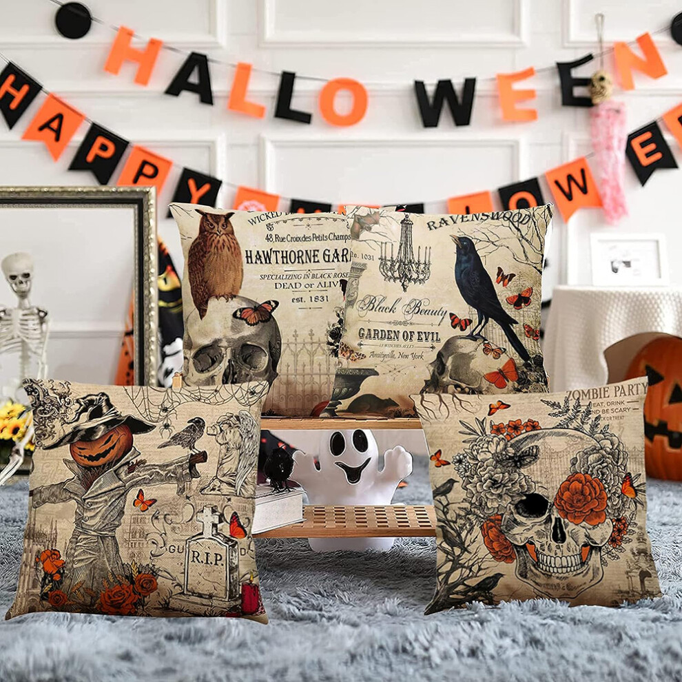 Halloween Decorative Throw Pillow Covers, Square Cushion Covers for Outdoor Sofa Couch, Scarecrow Skull Pumpkin Design, Polyester And Linen, 4PCS,