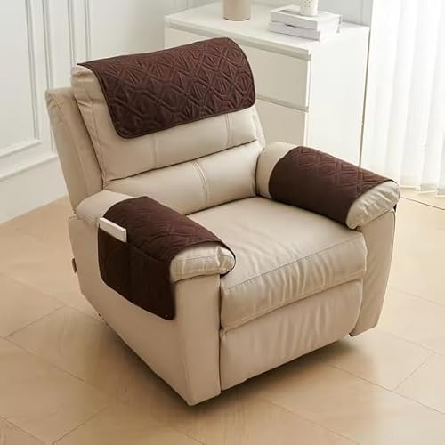 Non-Slip Quilted Armrest and Headrest Covers for Sofa Recliner, Waterproof Furniture Protector with Side Storage Pocket, 45x90cm Pet-Resistant Machine Washable(Coffee,1pc-B)