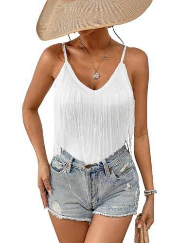 Ladies Fringe Tank Tops - Cowgirl Festival Outfit Sexy Summer Vest Tops for Women Adjustable Spaghetti Straps Tassel Solid Sleeveless V Neck Camisole (White,M,10742w)