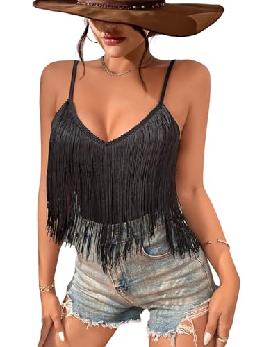 Womens Fringe Tank Top - Rave Festival Cowgirl Outfit Sexy Spaghetti Straps Cami Tops Solid Tassel Sleeveless Camisole V Neck Shirts Ladies Summer Vests Fancy Dress Costume(Black,S,10742r)