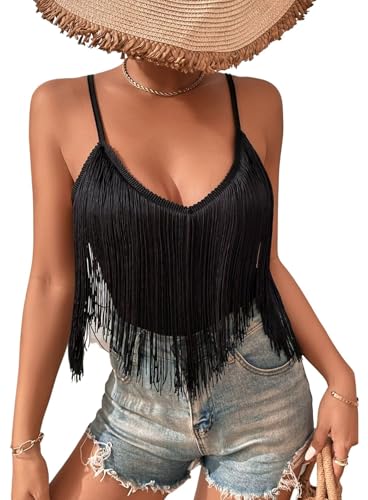 Ladies Fringe Tank Tops - Cowgirl Festival Outfit Sexy Summer Vest Tops for Women Adjustable Spaghetti Straps Tassel Solid Sleeveless V Neck Camisole (Black,M,10742w)