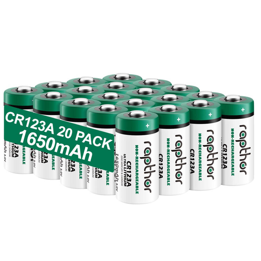 Rapthor 1650mAh CR123A 3V Lithium Battery CR123 123A CR17345 High Power Lithium Batteries with Built-in PTC for Flashlight Cameras Toys Alarm System Microphones (20Pack)