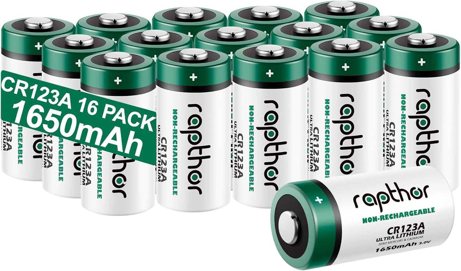 Rapthor CR123A 3V Lithium Battery 1650mAh High Power CR123 123a CR17345 Non-rechargeable Batteries with Built-in PTC for Flashlight Toys Alarm System Microphones (16 Pack)