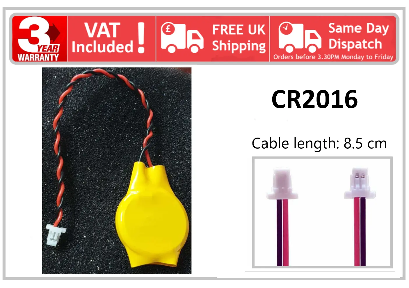 Dell Acer HP Lenovo MSI 2 Pin Long Thin JST Connector CR2016 BIOS CMOS Battery