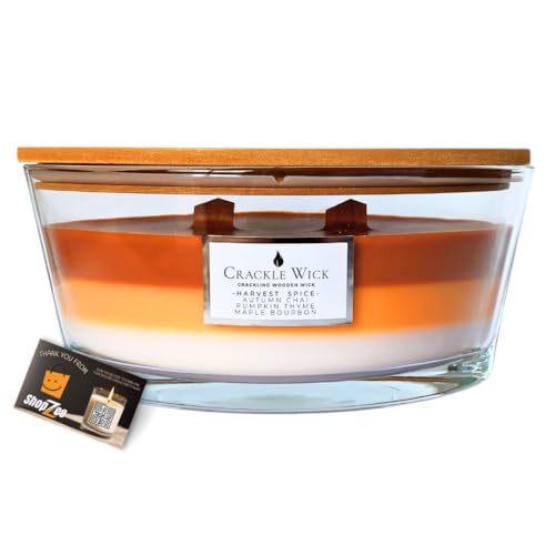 Crackle Wick 3-Layer Autumn Scented Candle 485g | Crackling Wooden Wick, Elegant Ellipse Glass | Autumn Candles Long Burning, Fall Decor Gifts | Includes ShopZee Safety Tips Guide (Harvest Spice)