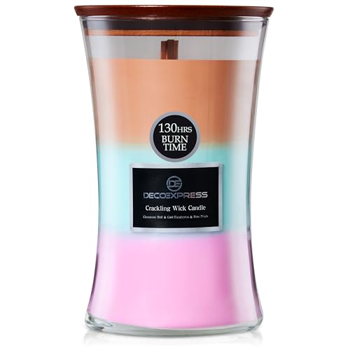 DECO EXPRESS Scented Candles with 3 Layer Scent Trilogy Crackle Wick Candle Up to 130 Hr Burn Time Hourglass Calming Home Decor Housewarming Gifts (Cinnamon Roll/Cool Eucalyptus/Rose Petals)