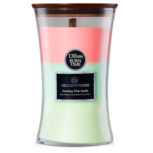 DECO EXPRESS Scented Candles with 3 Layer Scent Trilogy Crackle Wick Candle Up to 130 Hr Burn Time Hourglass Calming Home Decor Housewarming Gifts (Peach Jasmine/Fresh Sheets/Let it Snow)