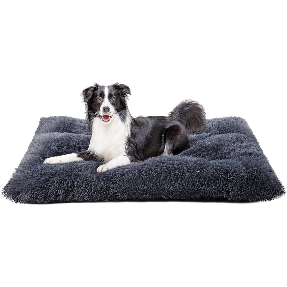 Fluffy Dog Crate Bed for Large Dogs, Plush Faux Fur Pad, Calming Anti-Anxiety, Washable, Non-Slip Bottom, Dark Grey