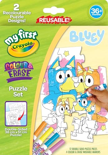 Crayola My First Colour & Erase Puzzle Set - Bluey | With 12 Double-Sided Puzzle Pieces & 4 Washable Markers | Reusable Puzzle Kit for Kids Ages 3+