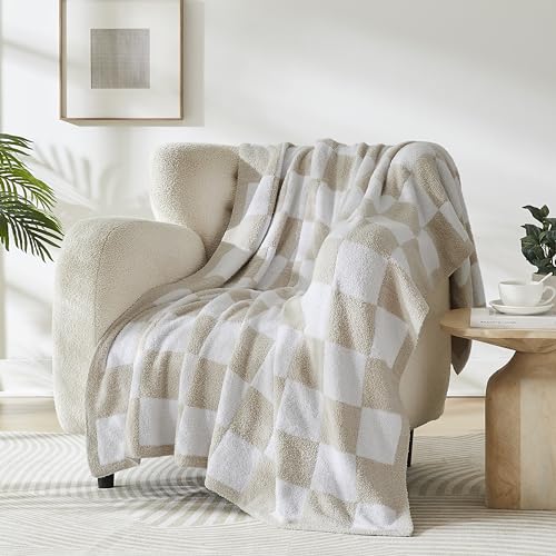 R.SHARE Beige Checkered Throw Blanket, Cream Microfiber Soft Cozy Lightweight Fluffy Warm Throw Blankets for Couch Sofa Chair Bed 50"x70"