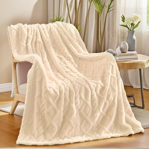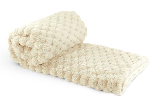 Homcomodar Throw Blankets 130x150cm Beige Throws for Sofas Fleece Blanket Cream Throws Warm Cozy Fluffy Blanket Striped Jacquard Throw Blanket for Couch