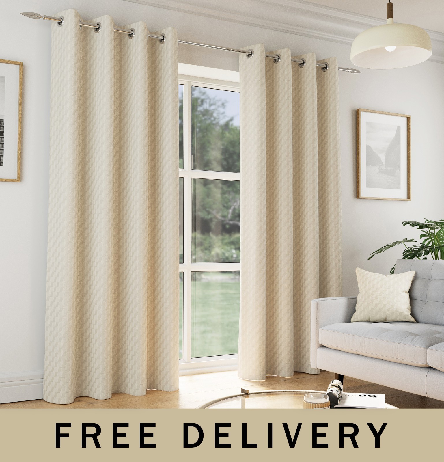 Cream 90x90" Eyelet Embossed Geometric Room Darkening Curtains For Living Rooms