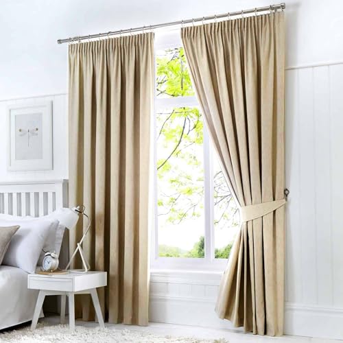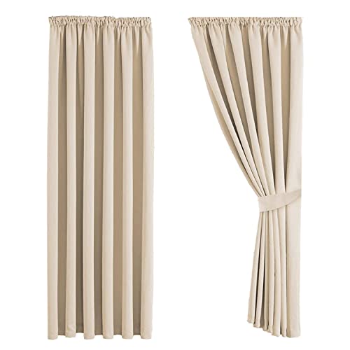 Aspire Homeware Pencil Pleat Blackout Curtains for Bedroom - Cream Curtains 90x90 Inch Drop - Thermal Insulated Soft Living Room Window Curtain with Matching Tiebacks, 2 Panels
