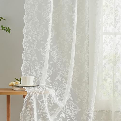 Kotile Ivory Lace Curtains 96 Inches Long - Country Floral Vintage Lace Window Curtains for Living Room, Premium Scalloped Floral Sheer Lace Curtain Panels, 52 x 96 Inch, 2 Panels, Ivory/Cream
