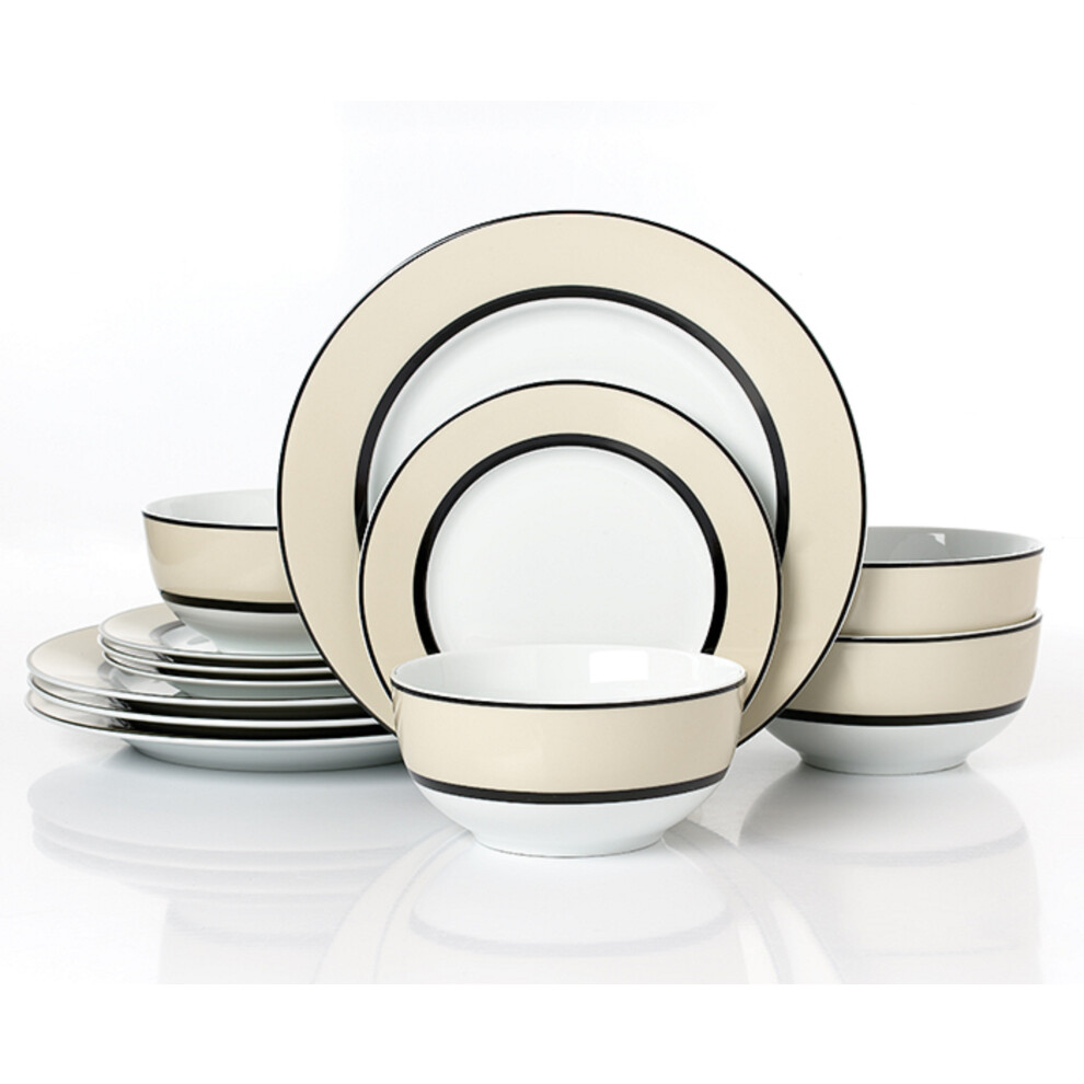 Corelle 12-Piece Vitrelle Glass Hush Lines Chip and Break Resistant Dinner Set, Service for 4, Cream
