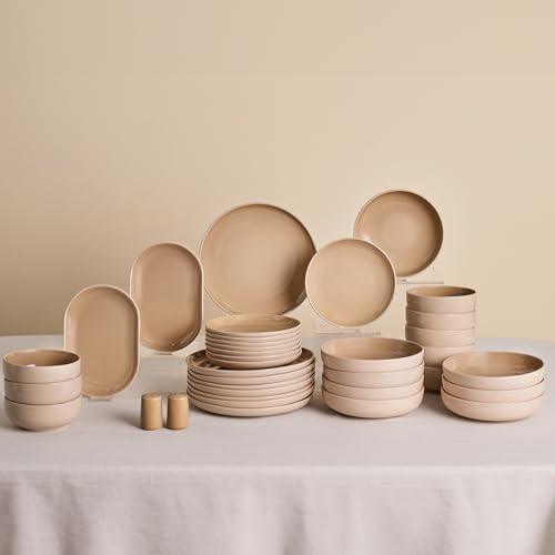 Karaca Terra 36-Piece Stoneware Dinner Set for 8 People, Dishwasher Safe, Microwave Safe, Dinner Plate, Pasta Bowl, Side Plate, Soup Bowl, Serving Platters, Cream
