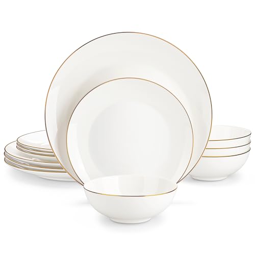MALACASA Bone China Dinnerware Set, 12 Pieces Cream-White Plates and Bowls Sets with Gold Rim, Dinner, Dessert and Cereal Bowls, Series JERA