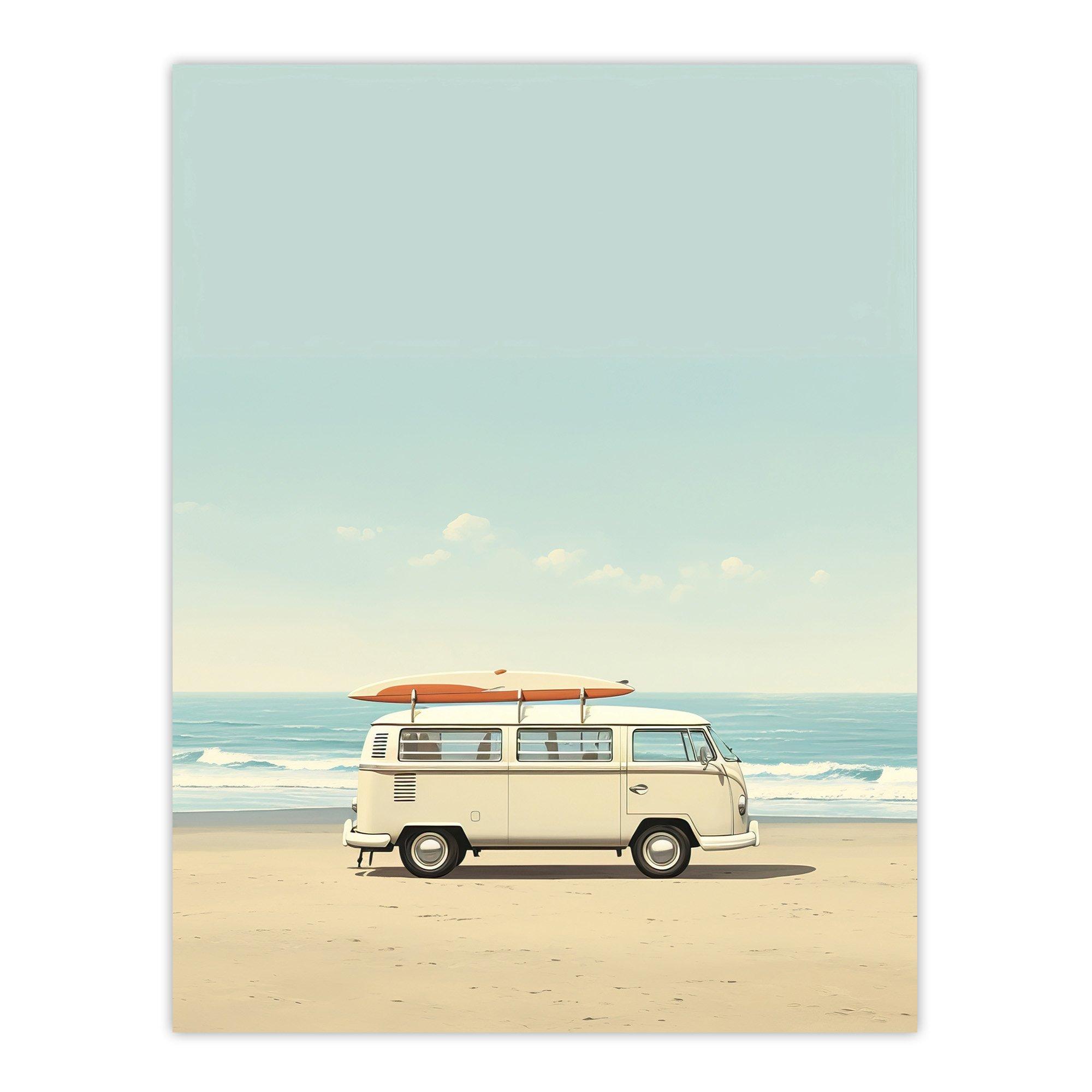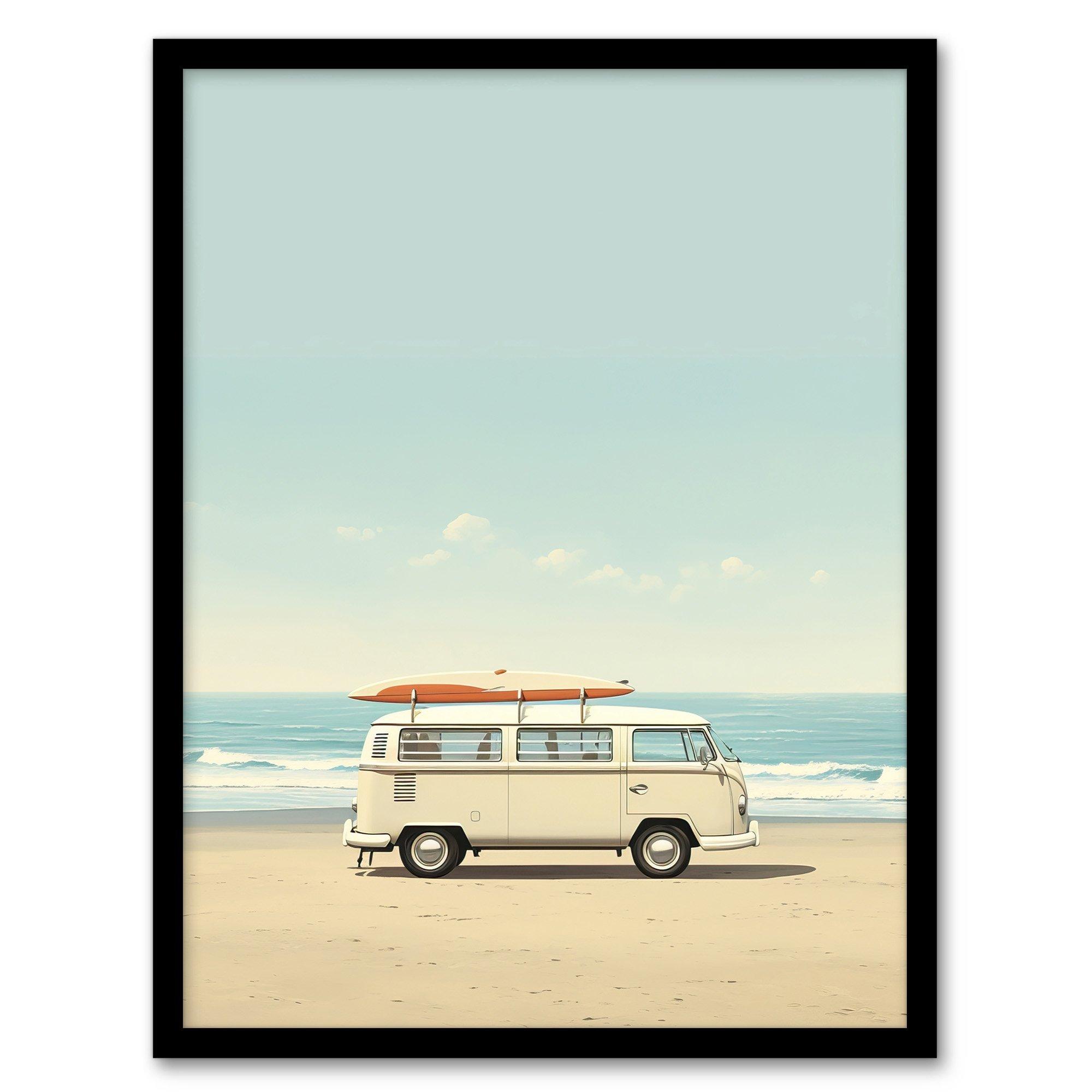 Gone Surfing Camper Van Calm Beach Cream Living Room Wall Art Print
