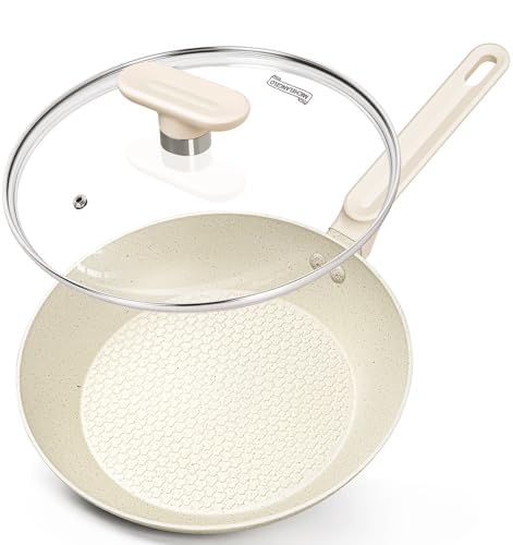 MICHELANGELO Frying Pan with Lid 26cm, Non Stick Pan, 26 cm Skillet with Nonstick Stone Coating, Healthy & Non-Toxic Granite Frying Pans, Compatible for Induction, Cream White
