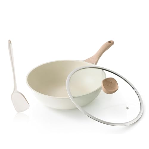 Kordisen Non Stick Induction Wok Pan, 30cm Deep Stir-Fry Pans Cream White