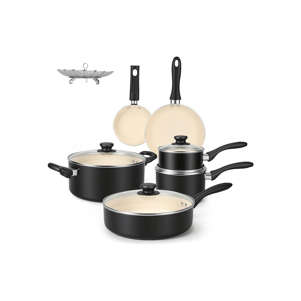 (11-Piece, Black/Cream) Ceramic Non-Stick Pots and Pans, 11-Piece Cookware Set, PFOA- and PTFE-Free, Black/Cream