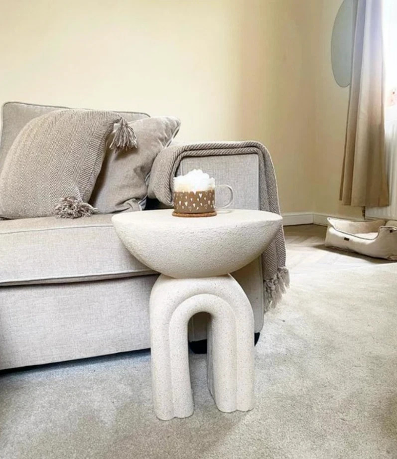 FURTOGUYI Modern Cream White Round Side Table, Sculptural 3D Pedestal Leg, Smooth Rounded Edges, Stable & Safe Minimalist Accent Table, Artistic Decorative Table for Living Room, Bedroom or Office