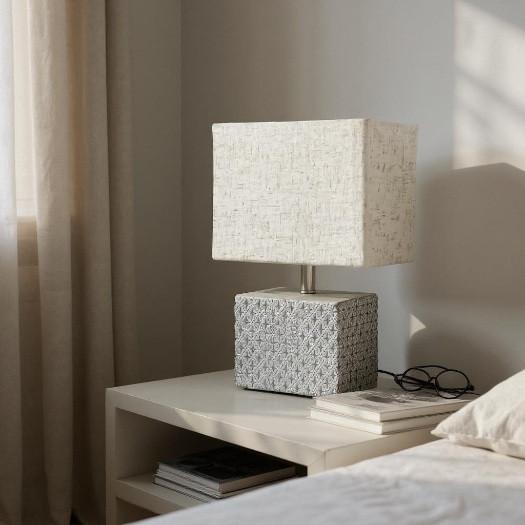 Stylish Cream Cement Table Lamp with Fabric Shade – Compact Lighting for Bedroom