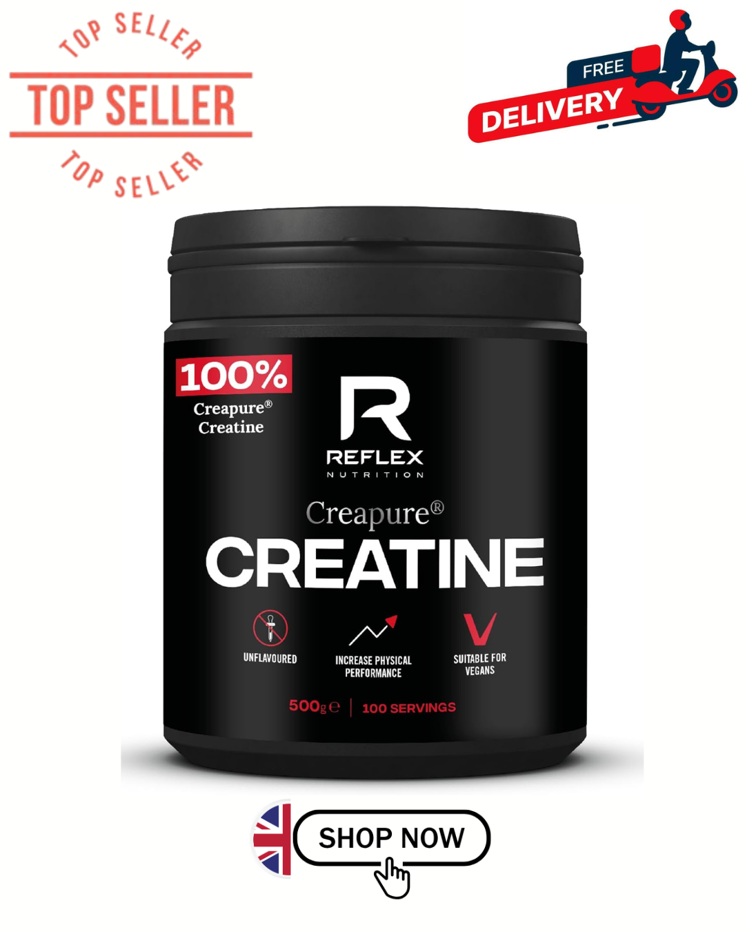 Reflex Nutrition Creapure® Creatine Monohydrate Powder Unflavoured - 100% Creatine for Strength, Muscle Gains & Recovery - No Fillers or Additives - 500g (Vegan Creatine 5g per Serving, 100 Servings)