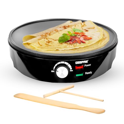 Geepas 1000W Pancake & Crepe Maker - Electric Non-Stick Cooking Plate with Adjustable Temperature Control - Power & Ready Lights Wooden Spreader & Spatula Included - 2 Year Warranty