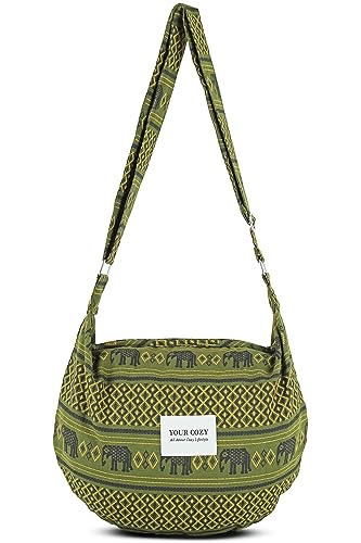 YOUR COZY Crescent Crossbody Bag for Women – Large Boho Cotton Sling Purse with Zipper | Lightweight Hobo Messenger Shoulder Bag (Green Elephant)
