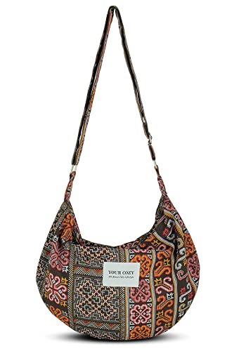 YOUR COZY Crescent Crossbody Bag for Women – Large Boho Cotton Sling Purse with Zipper | Lightweight Hobo Messenger Shoulder Bag (Tribe_Chocolate)