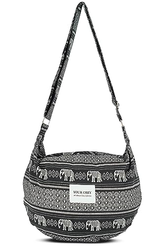 YOUR COZY Crescent Crossbody Bag for Women – Large Boho Cotton Sling Purse with Zipper | Lightweight Hobo Messenger Shoulder Bag (Black Elephant)
