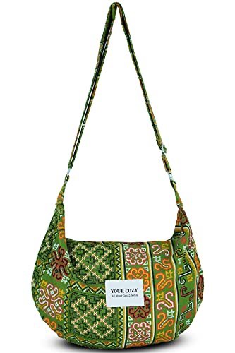 YOUR COZY Crescent Crossbody Bag for Women – Large Boho Cotton Sling Purse with Zipper | Lightweight Hobo Messenger Shoulder Bag (Tribe_Green)