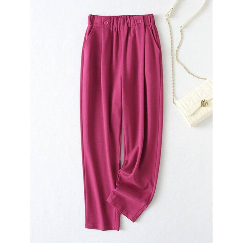 Summer Women Hotpink Crip Trousers Strethy Waist Pockets Female Suit Pants Casual Pants Point