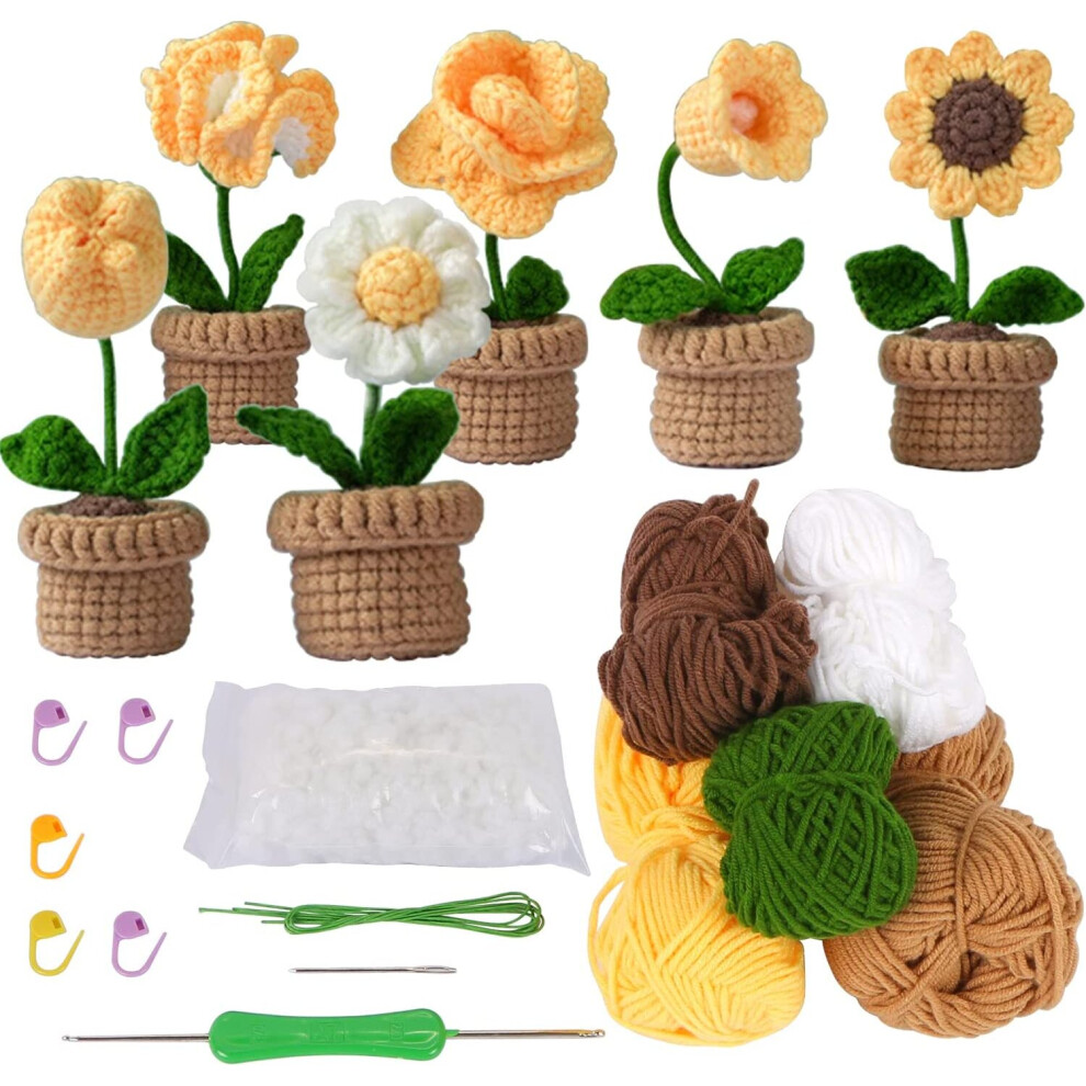 6 PCS Potted Plants Beginner Crochet Kit with Yarn Hook Needles Complete Crochet & Craft Kit for Beginners Crochet Set