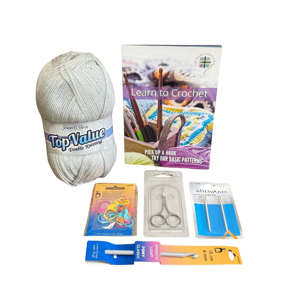 Beginner Crochet Kit - DK Yarn 6mm Hook Scissors Yarn Needle Stitch Markers & Booklet