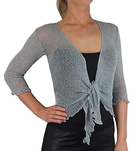 Mimosa Ladies Crochet Shrug Bolero Glitter or Plain Super Stretchy Lace Fish Net Tie at Waist Bolero Open Cardigan Fits UK 6-28