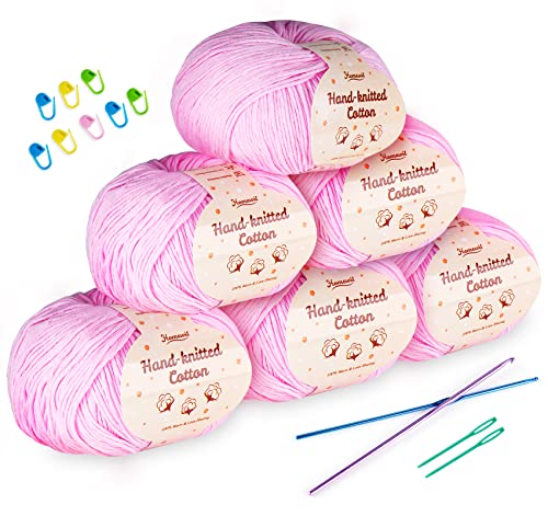 Cotton Crochet Yarn Set, Homewit 6 PCS Knitting Wool for Beginners Adults, 50g Soft Crochet Wool with Crochet Hooks Needles Yarn for Crochet DIY Handcrafts Decorations, Crochet Starter Kit (Pink)