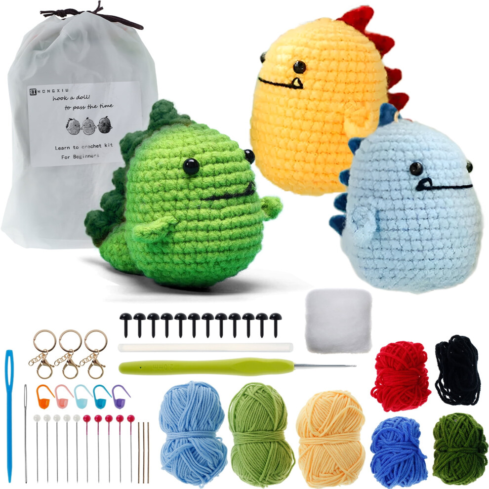 Qenwkxz Beginner Crochet Kit, Cute Colorful Dinosaurs Crochet Set, Professional Starter Kit for Adults and Kids, DIY Craft Art Accessories