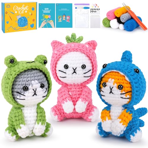 Cat Crochet Kit for Beginners with Video, Frog Shark Crochet Kit Cosplay Animal Knitting Kit Crocheted Animal Kits Complete Kitten Crochet Starter Animals Cosplay Set Beginners Crocheted Cat Kit