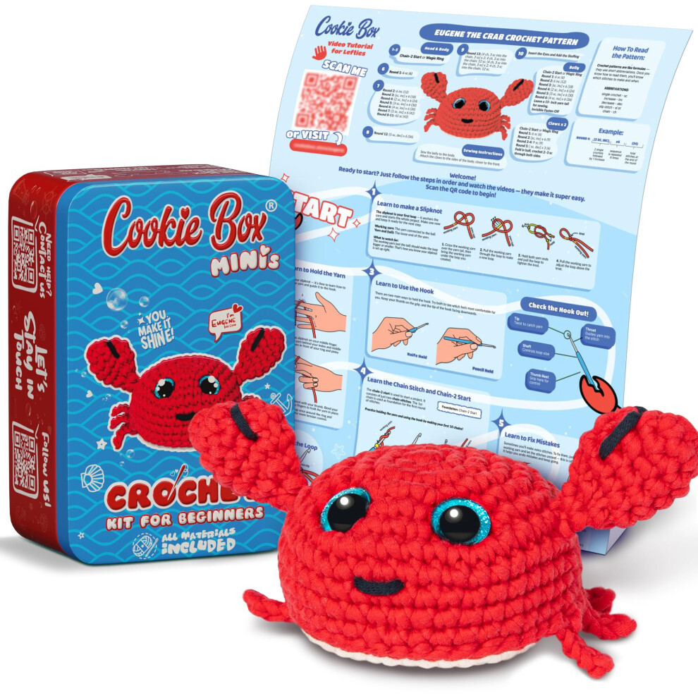 Cookie Box MINIs Crochet Kit for Beginners ? Gift Set to Make Crab Eugene Amigurumi Plushie ? Easy DIY Crochet & Knitting Starter Kit with Printed