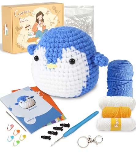 Ktmeor Beginners Crochet Kit,Learn to Crochet Kit with Step-by-Step Video Tutorials,Crochet Starter Kit for Adults and with DIY Knitting Supplies,40% Extra Practice Yarn- Penguin