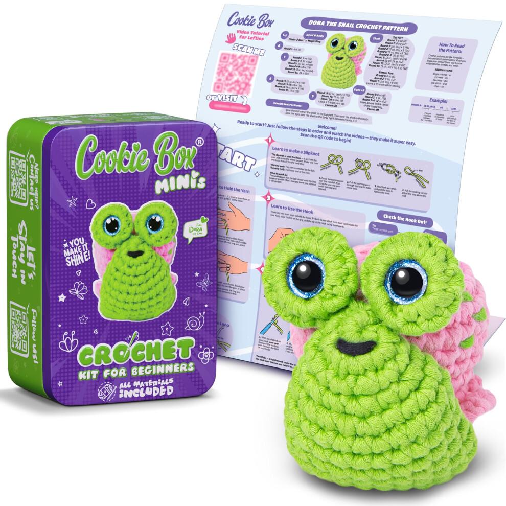 Cookie Box Crochet Kit for Beginners ? Gift Set to Make Snail Dora Amigurumi Plushie ? Easy DIY Crochet & Knitting Starter Kit with Printed