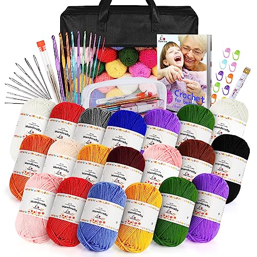 Aeelike Crochet Kits for Beginners Adults with Instructions, Beginners Crochet Kit for Kids, Professional Crochet Starter Kit with Metal Crochet Hooks, 20 Yarn Balls(25g) and Black Storage Bag
