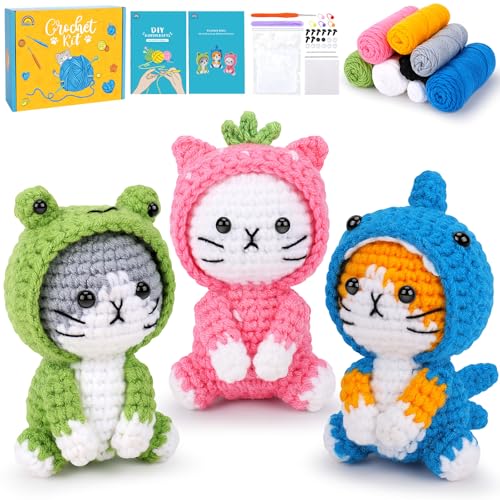 Cat Crochet Kit For Beginners with Video, Frog Shark Crochet Kit Cosplay Animal Knitting Kit Crocheted Animal Kits Complete Kitten Crochet Starter Animals Cosplay Set Beginners Crocheted Cat Kit