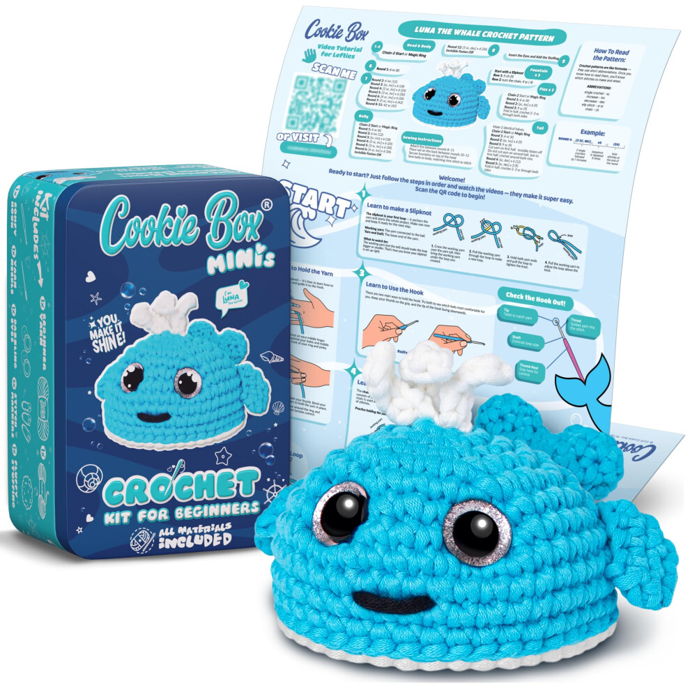 Cookie Box MINIs Crochet Kit for Beginners ? Gift Set to Make Whale Luna Amigurumi Plushie ? Easy DIY Crochet & Knitting Starter Kit with Printed