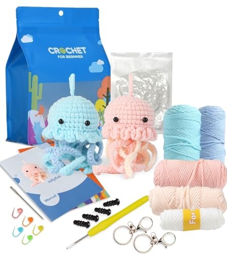 Ktmeor Crochet Kit for Beginners,Crochet Animal Kit for Beginners 2 Jellyfish with Step-by-Step Video Tutorials,Crochet Starter Kit DIY Knitting Supplies for Adults 40% Extra Practice Yarn