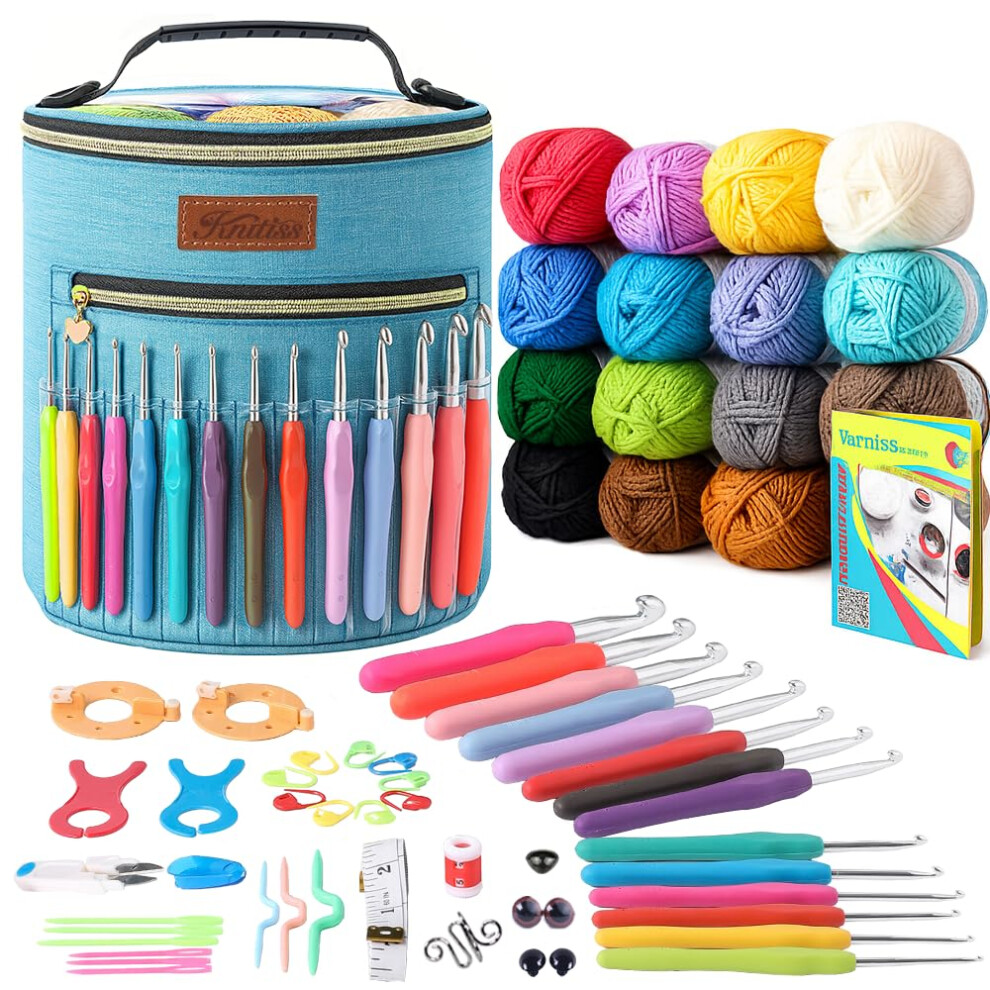 AOTWAN Crochet Kits for Beginners Adults Crochet Hooks Set 12Pcsx25g Crochet Yarns Include Ergonomic Metal Crochet Hooks 2-6.5mm Knitting Kit Accessories Tools Storage Case Crochet Starter Kit-Blue
